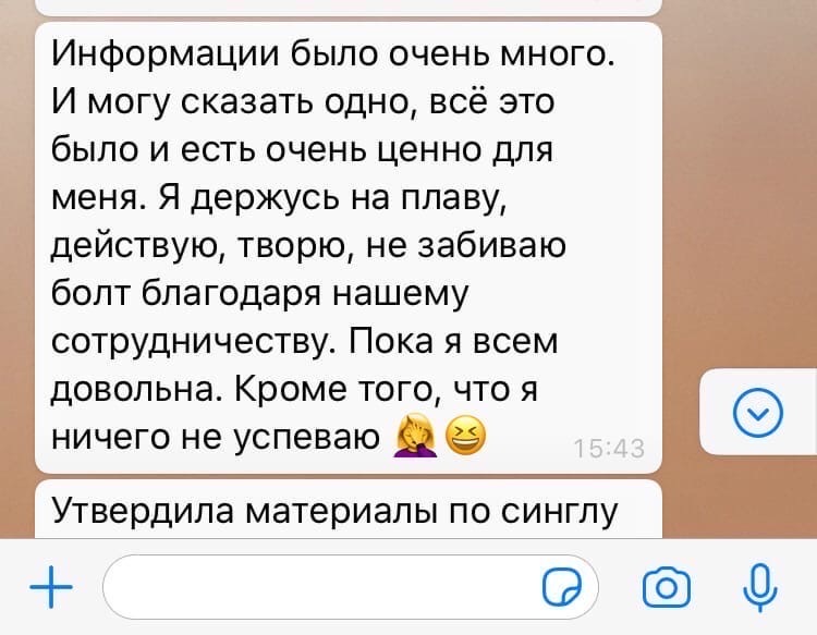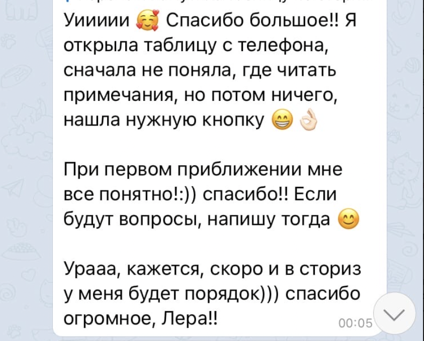 В назначенное время мы созваниваемся в Телеграм или Zoom. После консультации присылаем конспект, где тезисно расписаны основные вопросы, которые мы обсудили + передаем чек-листы, инструкции, дополнительные полезные материалы по теме. Также в течение недели после консультации доступен чат, где можно задать вопросы, которые могут вас «догнать» после созвона: что-то, что вы могли не успеть или не подумать сразу узнать.